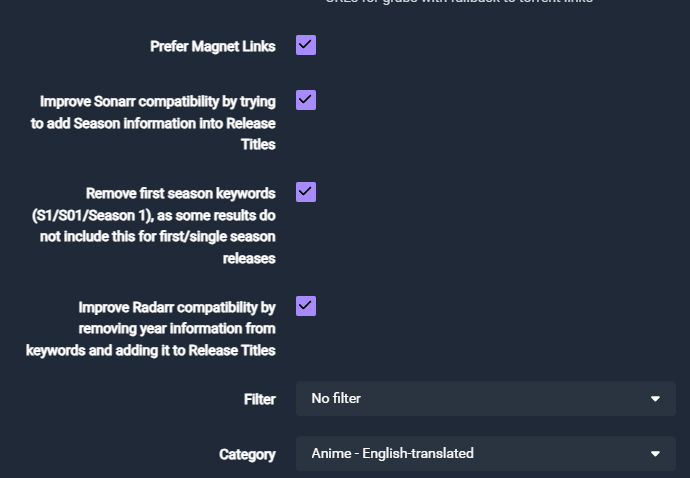 Not all anime releases include English subtitles. If you want to filter for only releases with English subtitles, or if you prefer raw (no subs) releases, you can configure this in Prowlarr.